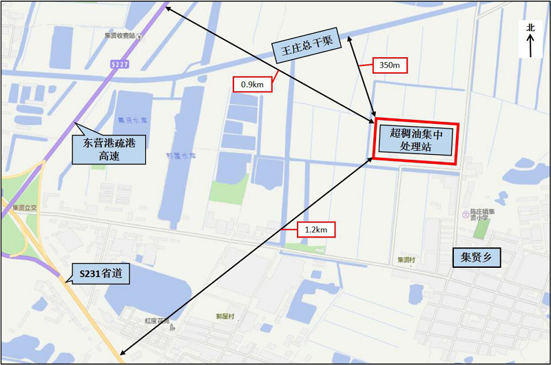 超稠油集中處理站位于東營市利津縣集賢鄉(xiāng)西北側(cè),王莊總干渠南350m處,東南側(cè)為集賢村居民房屋,區(qū)域外圍有東營港疏港高速、S231省道等,分別距離約0.9km、1.2km。西側(cè)和北側(cè)均為農(nóng)田。新建污水沉降罐距離東側(cè)消防水罐35m,距離東南側(cè)消防泵房33m,距離東南側(cè)辦公樓44m,距離南側(cè)值班室和化驗(yàn)室42m,距離西南側(cè)加熱爐66m,距離西南側(cè)鍋爐操作間43m,距離西側(cè)消防器材間19.5m,距離西側(cè)聯(lián)合泵房33.5m,距離北側(cè)油罐區(qū)38m。 |