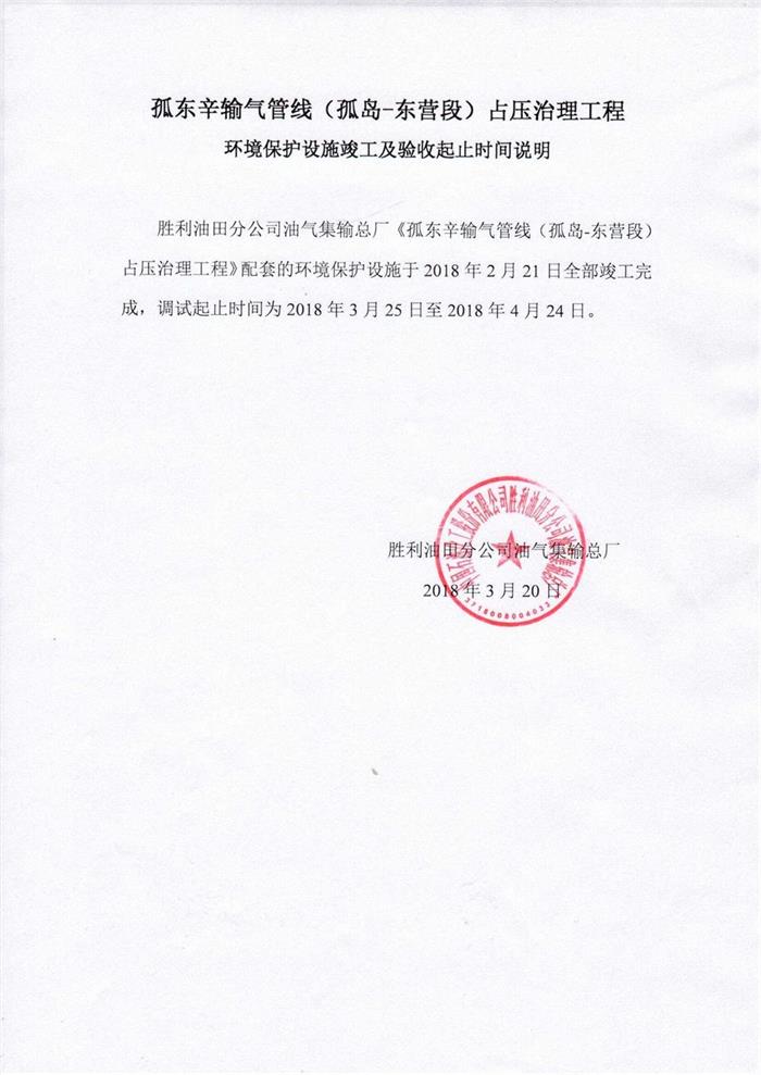 孤東辛輸氣管線(孤島-東營(yíng)段)占?jí)褐卫砉こ汰h(huán)境保護(hù)設(shè)施竣工及驗(yàn)收起止時(shí)間說(shuō)明