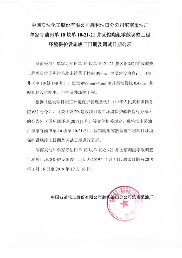 中國(guó)石油化工股份有限公司勝利油田分公司濱南采油廠單家寺油田單10塊單10-21-21井區(qū)館陶組零散調(diào)整工程環(huán)境保護(hù)設(shè)施竣工日期及調(diào)試日期公示