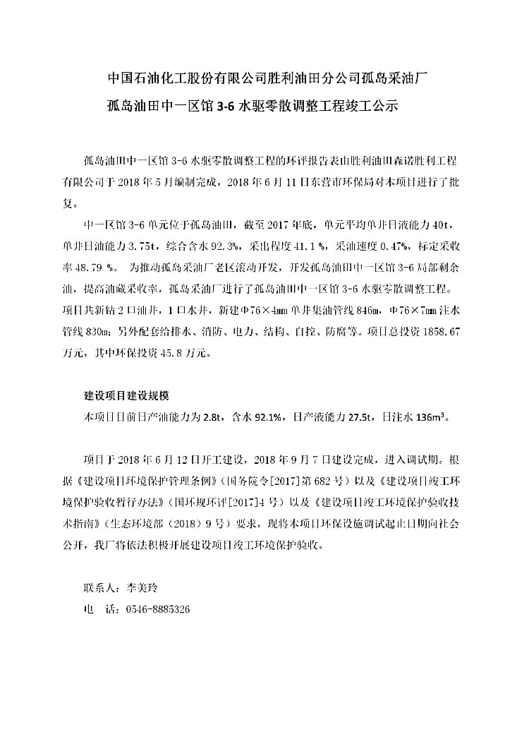 中國(guó)石油化工股份有限公司勝利油田分公司孤島采油廠孤島油田中一區(qū)館3-6水驅(qū)零散調(diào)整工程竣工公示