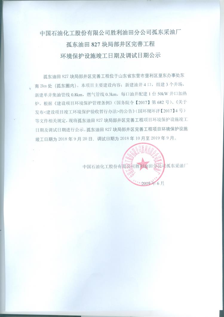 中國石油化工股份有限公司勝利油田分公司孤東采油廠孤東油田827塊局部井區(qū)完善工程環(huán)境保護(hù)設(shè)施竣工日期及調(diào)試日期公示